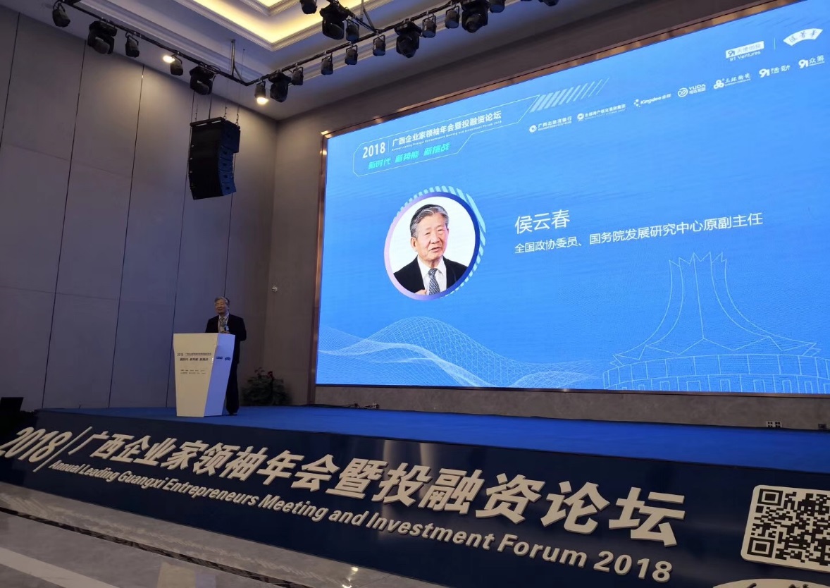 全国政协委员、国务院发展研究中心原副主任、著名经济学家侯云春围绕“培育新势能,迎接新挑战!”进行主旨演讲,从宏观经济角度分析了国内外当前的经济形势,他表示如何进行产业转型、进一步推进产业融合发展,成为了广西民营企业发展最核心的问题。