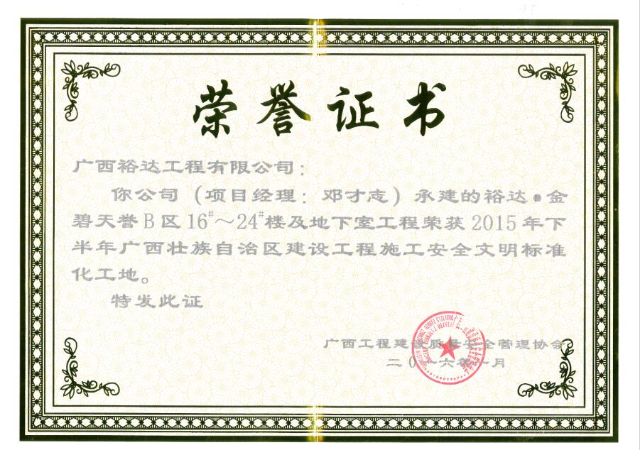 裕达·金碧天誉B区16#-24#楼及地下室工程荣获2015年下半年“广西壮族自治区建设工程安全文明标准化工地”