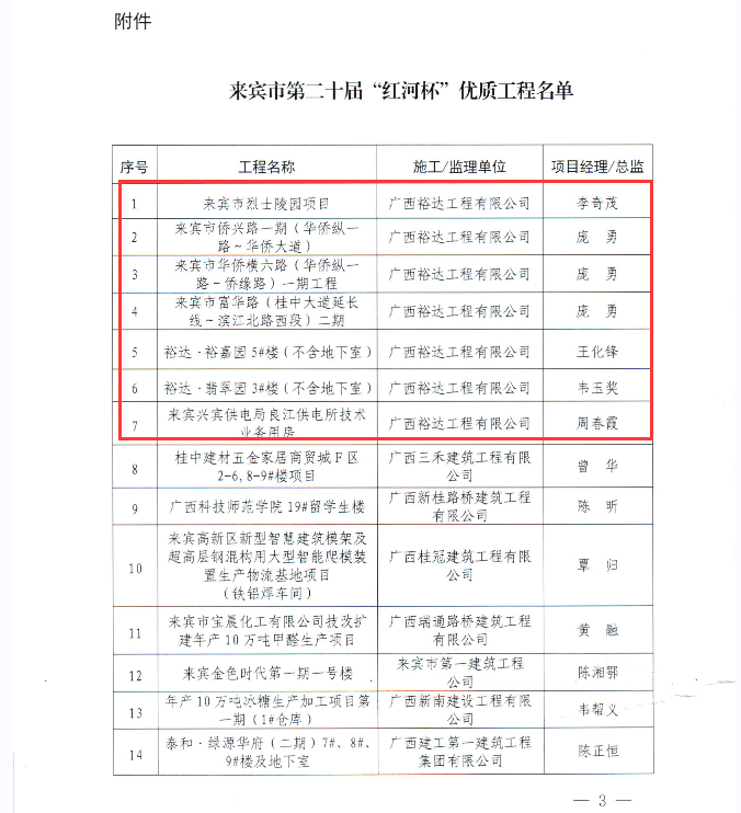 5月10日,来宾市建筑业联合会印发《关于公布来宾市第二十届“红河杯”优质工程名单的通知》,开云集团有限公司承建的来宾市烈士陵园项目、裕达•裕嘉园5#楼(不含地下室)、裕达•翡翠园3#楼(不含地下室)等共8个项目荣获来宾市第二十届“红河杯”优质工程奖。