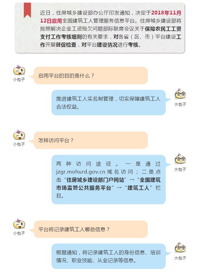 为贯彻落实《国务院办公厅关于促进建筑业持续健康发展的意见》(国办发〔2017〕19号),推进建筑工人实名制管理,切实保障建筑工人合法权益,我部决定于2018年11月12日启用全国建筑工人管理服务信息平台(以下简称平台)。现将有关事项通知如下: