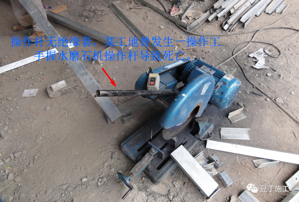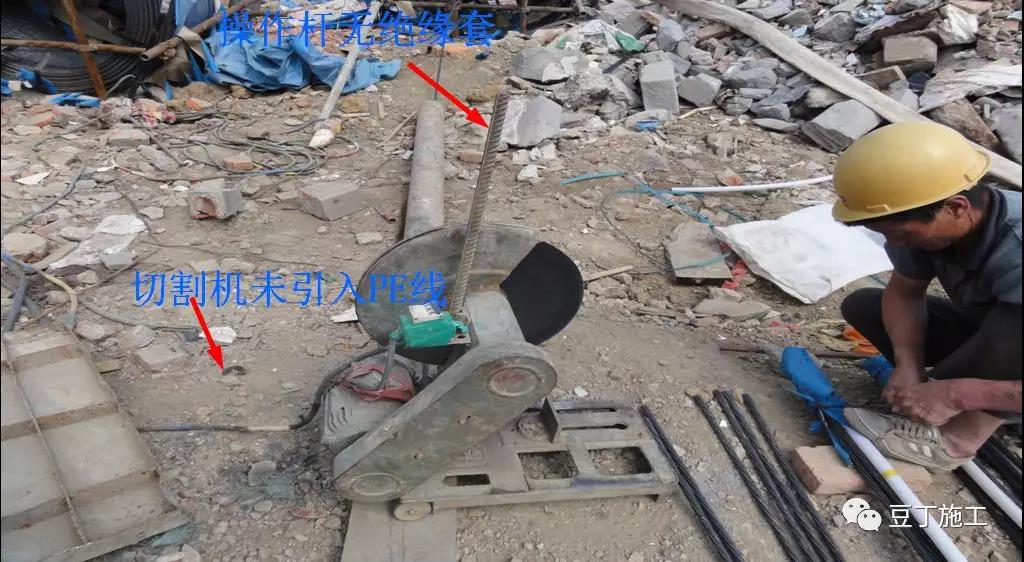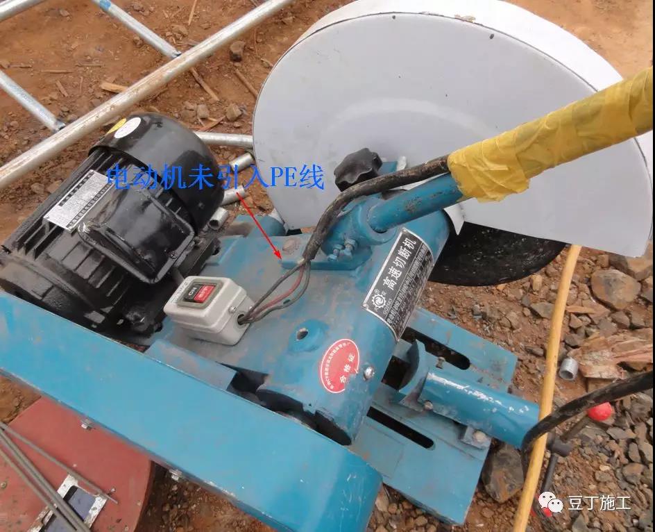 3、施工现场的施工机具,如电焊机、对焊机、碘钨灯等外壳不接PE线;钢筋弯曲机、钢筋剪切机、切割机、台钻、打气泵等电动机的接线盒内的专用PE端子95%以上不接PE线,而且多数的操作把手无绝缘套。这是最普遍、最严重地违规。