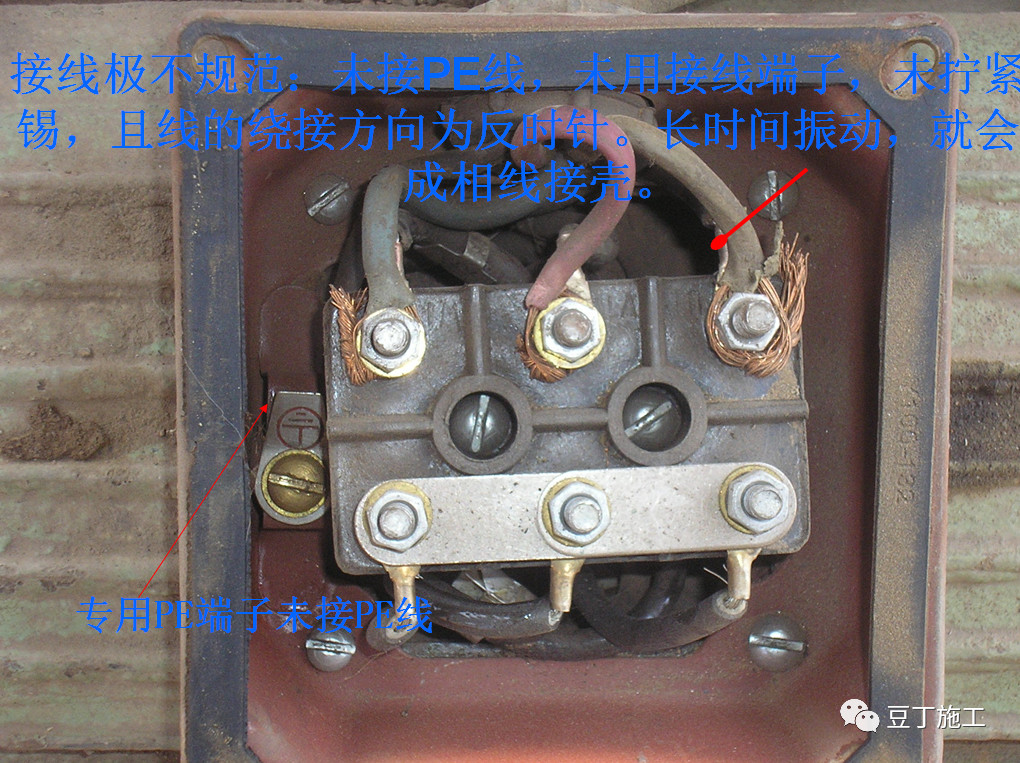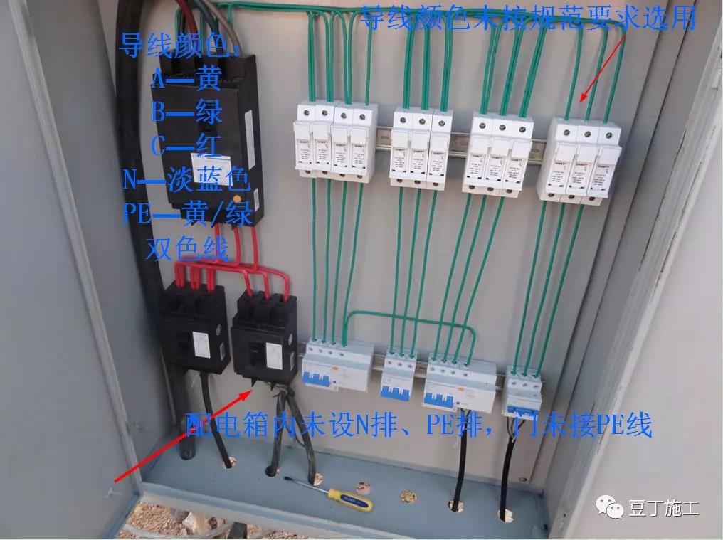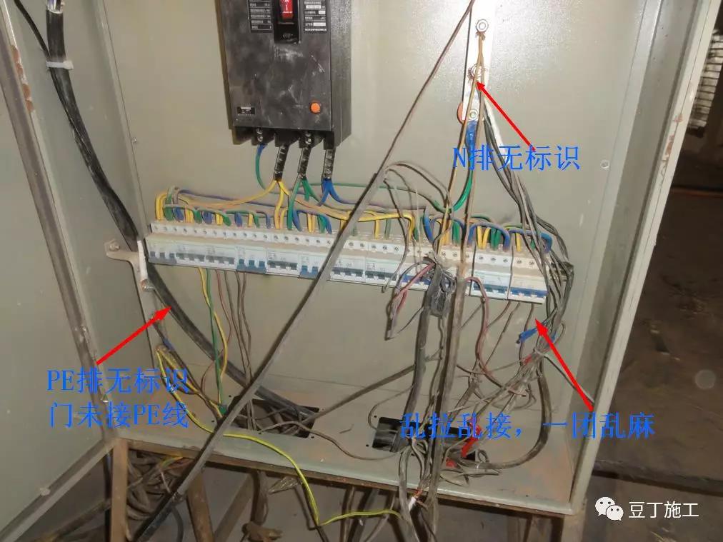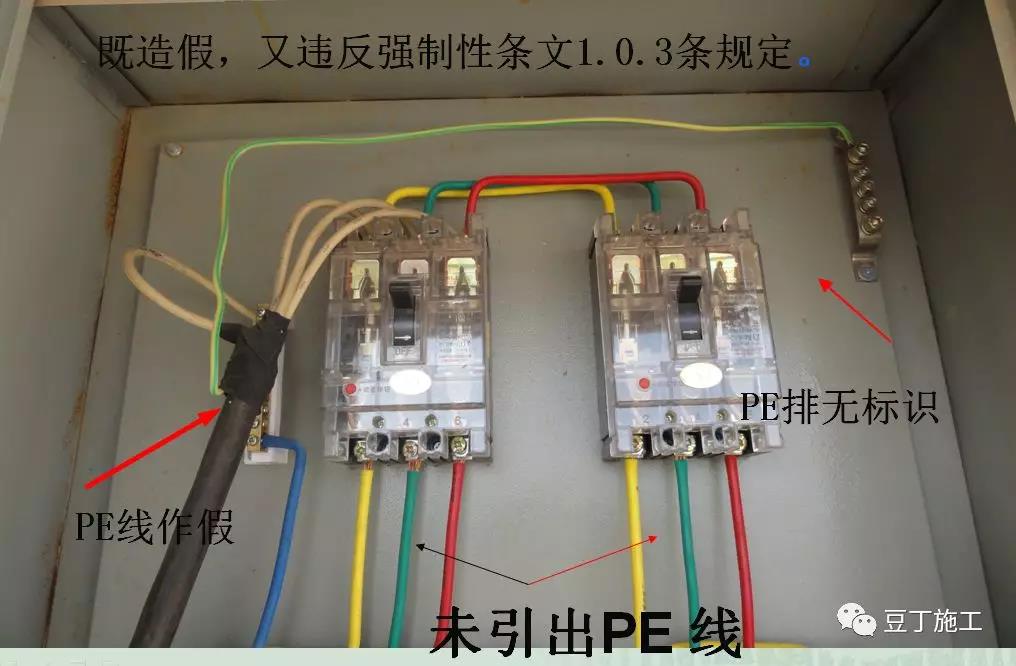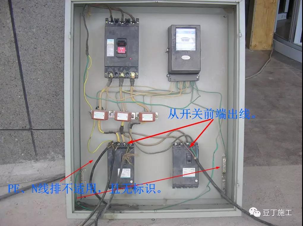 9、PE线、N线从开关箱内引出不规范。不是按要求从PE、N端子板引出,而是象蜘蛛网一样互相绕接后引出,乱拉乱接。违反强制性条文8.1.11条规定。