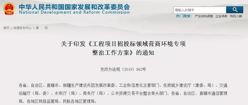 关于印发《工程项目招投标领域营商环境专项整治工作方案》的通知