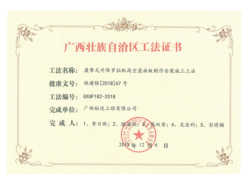 2018年广西壮族自治区工法证书(履带式升降罗拉机高空屋面板制作安装施工工法)